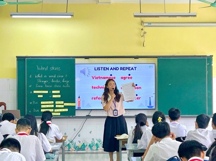 Tiết học được thiết kế theo hướng phát triển năng lực: học sinh khai thác bảng quy tắc trọng âm, luyện tập theo PowerPoint, tham gia Quizizz, thảo luận nhóm và xử lý tình huống ngữ âm. Qua đó, các em chủ động nhận diện trọng âm, sửa lỗi phát âm và chuyển hóa quy tắc thành kỹ năng làm bài trắc nghiệm – tự luận.